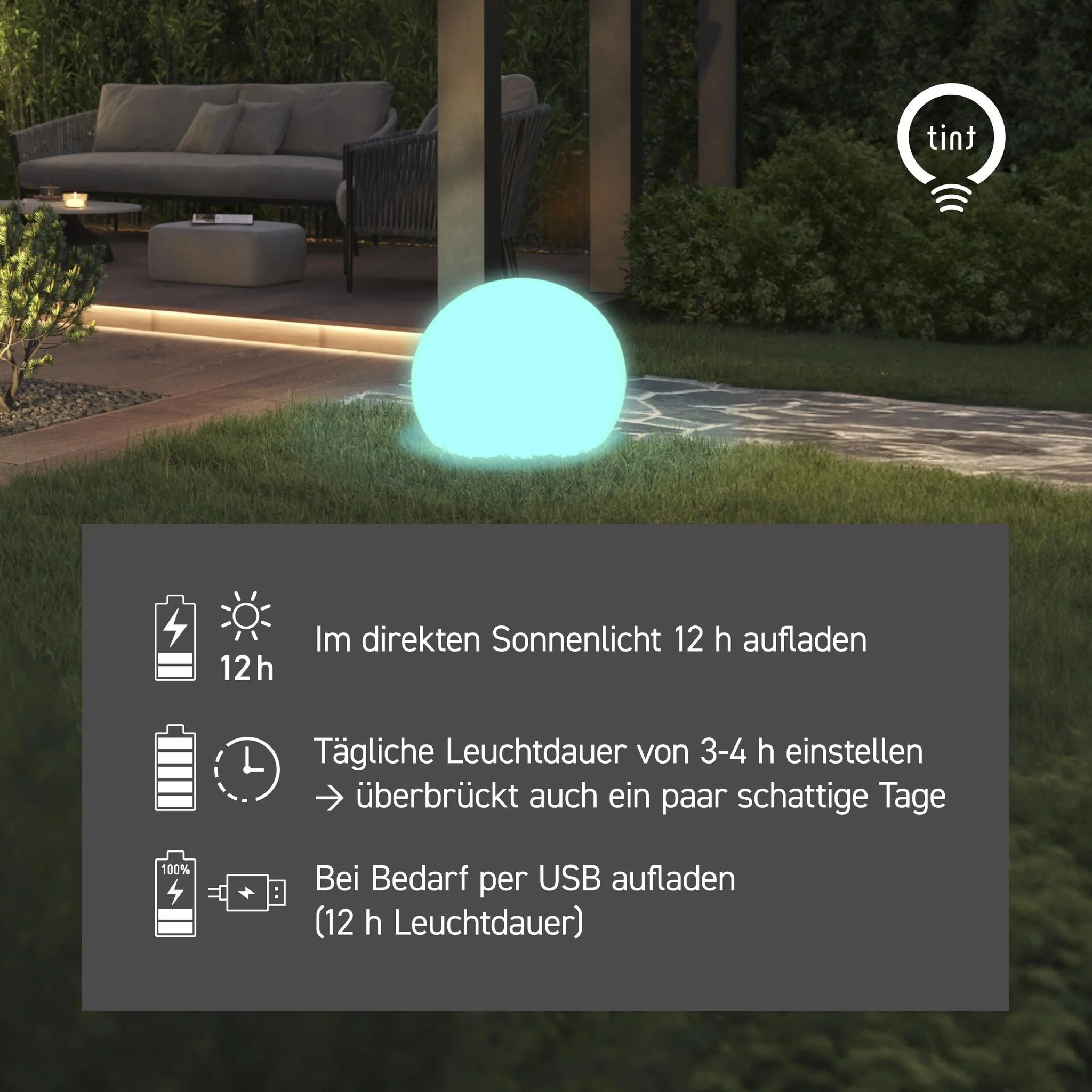 Entdecke die smarte LED-Leuchtkugel Calluna Solar, eine brillante Ergänzung für jeden Garten, jede Terrasse oder jeden Balkon. Die smarte Gartenkugel verwandelt deine Outdoor-Bereiche in wahre Wohlfühloasen. Mit einem Durchmesser von 25 cm macht Calluna optisch was her und verleiht deinem Außenbereich eine ganz besondere Atmosphäre. Das Herzstück der Calluna Leuchtkugel ist ihre innovative Solartechnologie. Ausgestattet mit einem integrierten Solarmodul und Akku, entfällt die Notwendigkeit für Kabel oder eine Stromquelle, was dir vollständige Freiheit bei der Platzierung deiner Leuchtkugel bietet. Ob inmitten deines Gartens, akzentuierend neben deinen Lieblingspflanzen oder als leuchtender Mittelpunkt auf deiner Terrasse – Calluna fügt sich nahtlos in jeden Außenbereich ein. Die Installation ist dank der mitgelieferten Erdspieße ein Kinderspiel und erlaubt es dir, innerhalb weniger Minuten ein leuchtendes Highlight zu setzen. Aber Calluna bietet mehr als nur einfache Installation und Flexibilität. Mit der Auswahl aus bis zu 16 Millionen Farben und verschiedenen Weißtönen kannst du die perfekte Stimmung für jede Gelegenheit schaffen. Von einem sanften Weiß, das eine beruhigende Atmosphäre für entspannte Abendstunden zaubert, bis hin zu lebendigen Farben, die jede Gartenparty zum Strahlen bringen – Calluna Solar passt sich deinen Wünschen an. Die Steuerung der Leuchtkugel erfolgt ganz einfach per tint Fernbedienung oder, für noch mehr Komfort, durch die Integration in bestehende Smarthome-Systeme mittels eines Zigbee-Gateways. So kannst du die Beleuchtung deines Gartens mit nur wenigen Klicks oder Sprachbefehlen anpassen und steuern. Die Nutzung von Solarenergie macht die Calluna Solar Leuchtkugel nicht nur zu einer äußerst praktischen, sondern auch zu einer umweltfreundlichen Beleuchtungslösung. Der optionale USB-C-Ladeanschluss bietet darüber hinaus Flexibilität für die Tage im Jahr, an denen die Sonne vielleicht nicht ausreichend Energie liefert. Mit der smarten LED-Leuchtkugel Calluna Solar wählst du nicht nur eine Beleuchtungslösung, sondern eine Bereicherung für deinen Außenbereich, die Stil, Komfort und Nachhaltigkeit vereint. Lass dich von der Vielfalt der Gestaltungsmöglichkeiten inspirieren und schaffe mit Calluna eine schöne Atmosphäre für entspannte Stunden. Ob für stimmungsvolle Abende allein, mit der Familie oder bei geselligen Zusammenkünften mit Freunden – Calluna ist die perfekte Wahl, um deinen Außenbereich in ein Lichtermeer zu verwandeln, das nicht nur die Nacht erhellt, sondern auch die Herzen deiner Gäste.