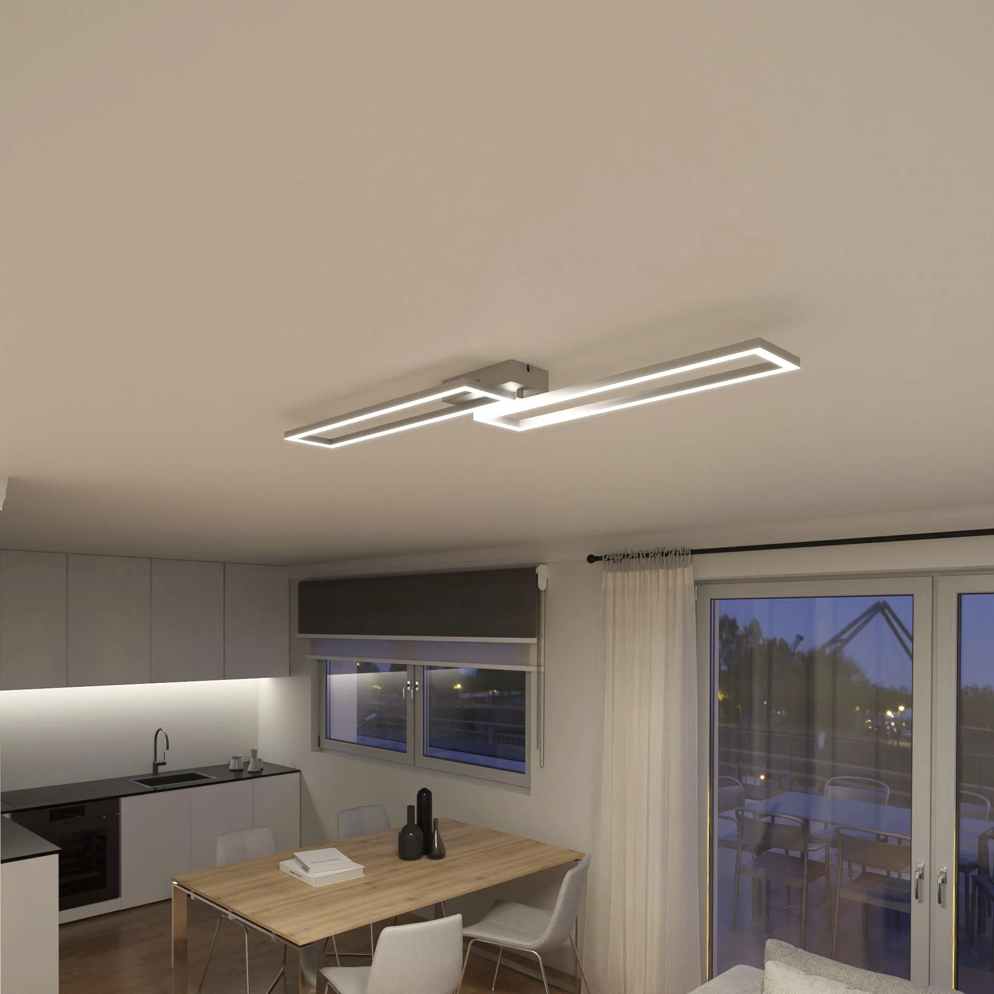 Die smarte LED-Deckenleuchte Ciso ist mehr als nur eine Lichtquelle – sie ist eine Revolution in der Art und Weise, wie wir Licht in unseren Wohn- und Arbeitsräumen einsetzen und erleben. Diese futuristisch anmutende Leuchte kombiniert hochwertiges Metall in Silber mit einem innovativen Design, das aus zwei rechteckigen Leuchtrahmen besteht. Ein Rahmen ist dabei flexibel drehbar, sodass du die Beleuchtung deiner Räume individuell gestalten und verschiedene Optiken erzeugen kannst, die genau deinem Geschmack und deiner Einrichtung entsprechen. Mit der Ciso Deckenleuchte trittst du in eine Welt, in der Beleuchtung nicht nur funktional, sondern auch ein elementarer Bestandteil des Wohnambientes ist. Ob in deinem Büro, deinem Flur, deiner Küche oder deinem Wohnzimmer, Ciso sorgt mit ihrer großflächigen Ausleuchtung und den modernen Lichtakzenten für eine Atmosphäre, die sowohl belebend als auch beruhigend wirken kann. Dank der integrierten tint white+color Technologie kannst du aus einer Vielzahl von Weißtönen wählen – von einem behaglichen, superwarmweißen Licht, das Wärme und Gemütlichkeit ausstrahlt, bis hin zu einem aktivierenden Tageslicht, das Klarheit und Konzentration fördert. Doch damit nicht genug: Bis zu 16 Millionen Farben stehen zur Verfügung, um jedem Raum eine persönliche Note zu verleihen. Die Steuerung der Ciso Deckenleuchte ist denkbar einfach und intuitiv. Beginne ohne Internetzugang mit der tint Fernbedienung und stelle verschiedene Farben sowie voreingestellte Lichtszenen ein. Ob du ein belebendes Arbeitslicht, eine bunte Partybeleuchtung oder ein entspanntes, an einen Sonnenuntergang erinnerndes Ambiente wünschst – tint ist sofort startklar und trifft stets den richtigen Ton. Für eine noch komfortablere Bedienung ermöglicht die intelligente Dual-Chip-Technologie, die Zigbee und Bluetooth in nur einem Produkt vereint, die Steuerung per Bluetooth über die kostenlose „tint Smart Light“ App. Ohne zusätzliche Geräte kannst du direkt loslegen und genießt dabei volle Flexibilität und Kontrolle über deine Beleuchtung. Die Kompatibilität mit ZigBee 3.0 eröffnet weitere Möglichkeiten, indem die Ciso Deckenleuchte in gängige Smarthome-Systeme integriert werden kann. Nutze fortgeschrittene Funktionen wie Zeitsteuerung oder die Kontrolle von unterwegs, um dein Zuhause noch intelligenter und reaktionsfähiger zu machen. Und für den ultimativen Komfort: Steuere deine Beleuchtung bequem per Sprachbefehl mit Amazon Alexa und allen Echo-Geräten mit integriertem Zigbee Smarthome-Hub. Die smarte LED-Deckenleuchte Ciso ist eine Einladung, dein Zuhause neu zu entdecken und zu erleben. Sie bietet nicht nur unzählige Möglichkeiten zur individuellen Lichtgestaltung, sondern setzt mit ihrem modernen, flexiblen Design auch starke visuelle Akzente. Verwandle deine Räume mit Ciso in Orte, wo Licht nicht nur erleuchtet, sondern Emotionen weckt, die Kreativität fördert und das Wohlbefinden steigert. Mach den Schritt in eine Zukunft, in der Licht mehr ist als nur Helligkeit – eine Zukunft, in der Licht zum perfekten Begleiter deines smarten Lebensraums wird.